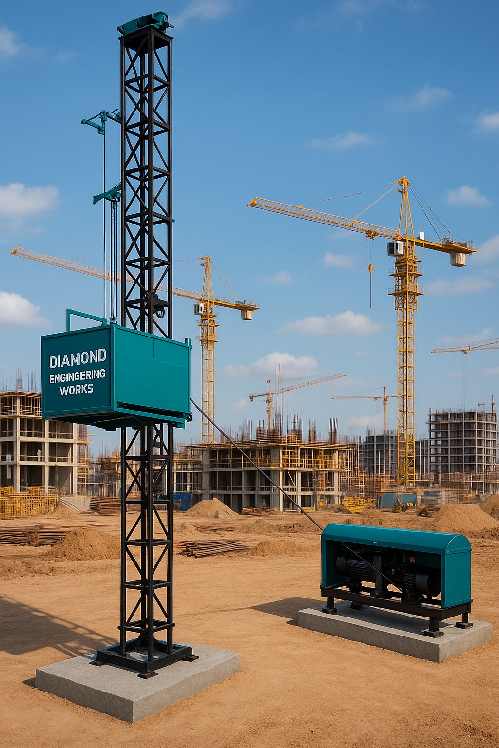 The Builder Hoist is a heavy-duty material lifting machine designed for safe and efficient vertical transportation of construction materials at building sites. Widely used in multi-story construction projects, it offers high load capacity, robust performance, and easy operation, making it an essential choice for contractors and builders. Key Features: Lifting Capacity: 500 kg to 1 ton (customizable as per requirement) Lifting Height: Up to 100 feet or more depending on site needs Motor: Powerful electric motor (single or three-phase) or diesel engine option Structure: Rugged MS fabricated frame for durability Wire Rope: High-tensile steel wire rope with rust protection Bucket Type: Heavy-duty tilting bucket for easy unloading of materials Control Panel: Simple and safe up/down operation with emergency stop Safety: Equipped with limit switches, brake system, and locking mechanism Mobility: Can be fixed or wheel-mounted for relocation on-site Applications: Lifting concrete, cement, bricks, and sand on construction sites High-rise and multi-story building projects Infrastructure and industrial construction work Benefits: Saves time and labor costs Ensures safe and quick lifting of heavy materials Reduces manual handling risks Low maintenance and long operational life