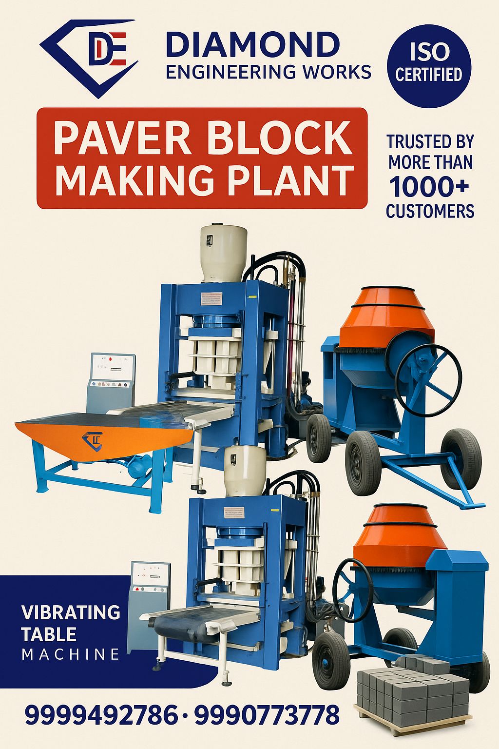 Interlocking Blocks Making Machine – Power, Precision & Performance by Diamond Engineering Works Diamond Engineering Works proudly introduces its advanced Interlocking Blocks Making Machine, designed to deliver strength, efficiency, and perfection in every block. Built for excellence, this machine combines modern technology, heavy-duty construction, and precision engineering to produce high-quality interlocking concrete blocks that meet today’s construction standards. Our Interlocking Block Making Machine is the perfect solution for builders, contractors, and manufacturers who demand durability, accuracy, and productivity. With its powerful vibration system and robust body, it ensures uniform compaction, smooth finishing, and dimensional accuracy in every block. The machine is capable of producing various shapes, sizes, and patterns of interlocking blocks — ideal for pavements, walkways, parking areas, and landscaping projects. Why Choose Diamond Engineering Works Interlocking Block Machine? At Diamond Engineering Works, we focus on innovation and reliability. Every component of our machine is built using high-quality materials and advanced manufacturing techniques, ensuring long service life, low maintenance, and consistent output. The machine’s user-friendly design makes it easy to operate, while its energy-efficient system helps save time, power, and labor costs. Whether you are setting up a new plant or expanding your existing production line, our Interlocking Block Making Machine delivers the perfect balance between performance and profitability. It enables fast production with minimal waste, helping you meet large-scale demands effortlessly. Key Features & Advantages: 🧱 Heavy-duty construction for continuous, long-term use. ⚙️ High-vibration and pressure system for solid, crack-free blocks. 🎯 Accurate mould design ensures perfect interlocking fit. 🔄 Easy operation and low maintenance for smooth production. 🌍 Suitable for fly ash, concrete, and cement-based blocks. 💡 Customizable models available as per client’s requirements. 🏗️ Ideal for paver blocks, kerbstones, and interlocking tiles. Applications: Our Interlocking Block Making Machine is widely used in construction projects, road works, landscaping, and urban development projects. It is perfect for producing blocks used in pathways, driveways, garden pavements, and retaining walls. The machine’s flexibility and performance make it a preferred choice among manufacturers across India. Built to Last – Designed for Growth With Diamond Engineering Works, you’re not just investing in a machine — you’re investing in quality, innovation, and trust. Our decades of experience in the construction machinery industry ensure that every product we deliver exceeds expectations in performance and reliability. We also provide complete plant setup solutions, including mixers, moulds, conveyors, and vibrating tables, making us a one-stop destination for all your block-making needs. From installation to after-sales service, we stand by our customers at every step. ✅ Precision-Built. Power-Packed. Performance-Driven. Choose Diamond Engineering Works – your reliable partner for high-quality Interlocking Block Making Machines that build stronger futures, one block at a time.